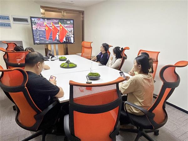 2025年9月3日,公司組織集體觀看紀念中國人民抗日戰爭暨世界反法西斯戰爭勝利80周年閱兵儀式,當嘹亮的國歌響起,屏幕上五星紅旗冉冉升起,會議室瞬間安靜下來,所有人都自發地起立,行注目禮,跟著旋律高聲唱起國歌,眼神中充滿了對祖國的敬意與熱愛。